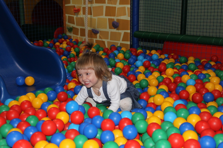 Утром когда она проснулась, мы подарили ей маленький подарочек-набор для лепки. И она тут же села лепить. Позавтракали и отправились в игровой центр. Там Верочка порезвилась на славу.