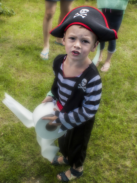 3 . Каждый пират должен уметь забинтовывать раны - обматывали руки, ноги, а потом уже и что получиться туалетной бумагой. Это для нас, взрослых, это старый надоевший конкурс со свадеб и юбилеев, а детям было очень весело, особенно выпутываться.