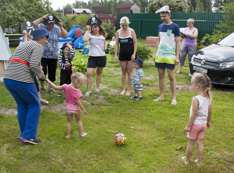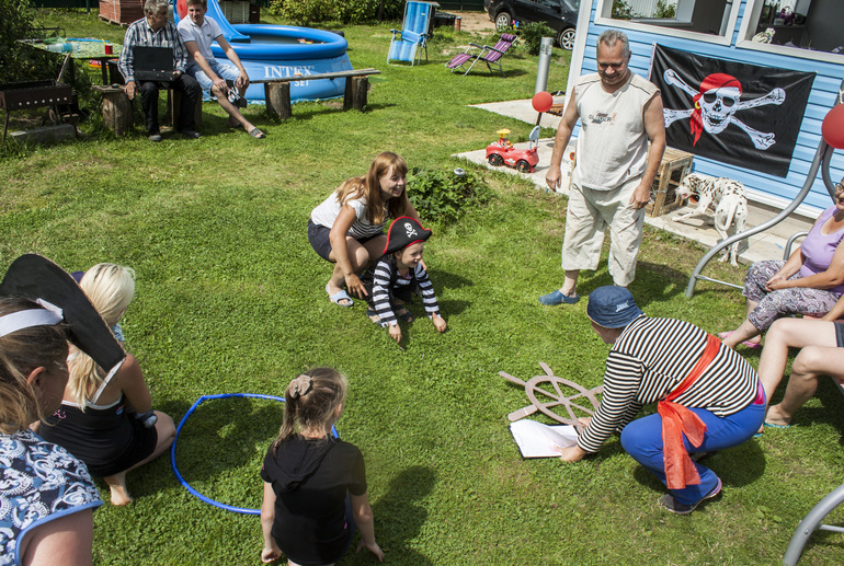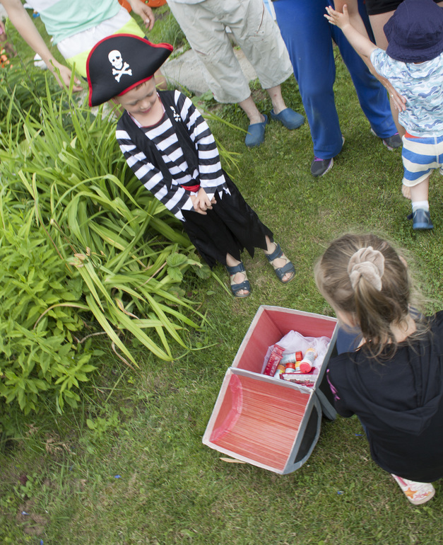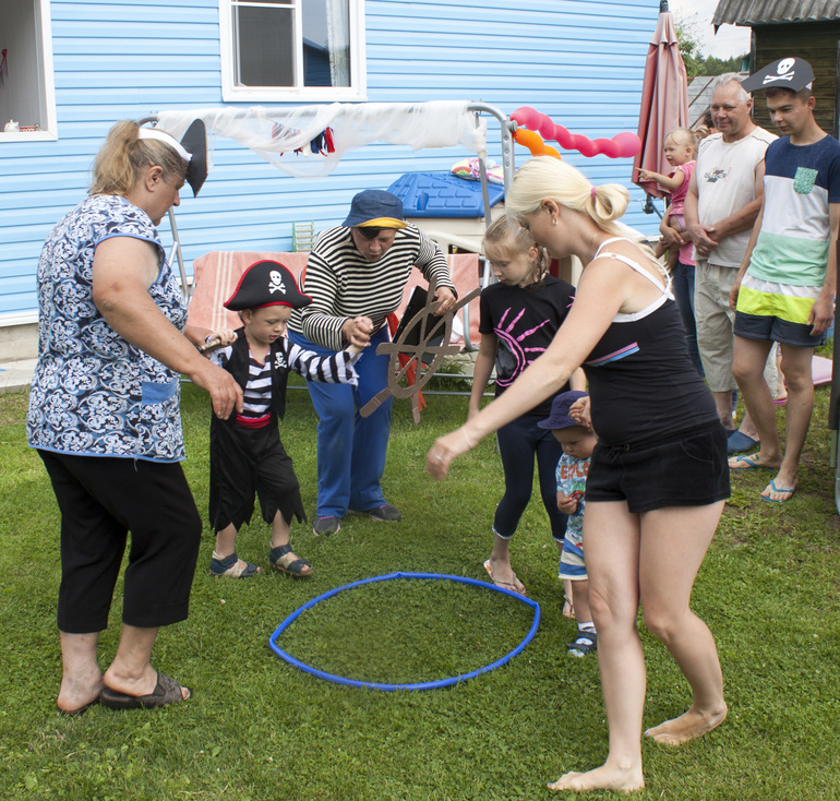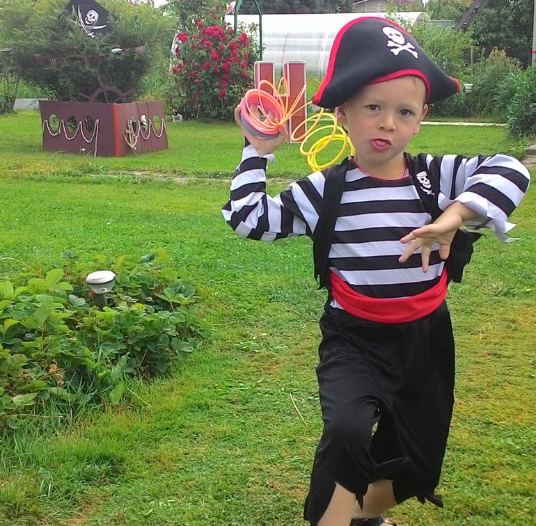 Утро началось с суматохи, пока главный пират спал, работа кипела полным ходом: батут превращался в рыбацкие сети, искали место швартовки коробля, развешивали флаги, натягивали паруса, и на веранде - трюме расставлялись вкусняшки.