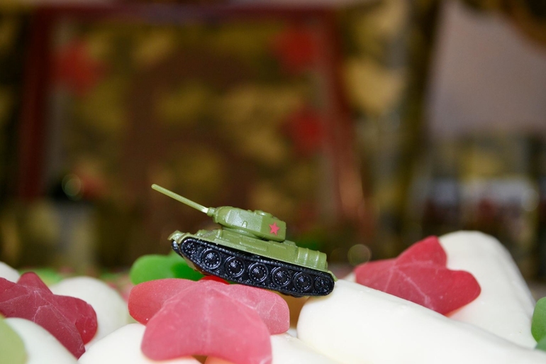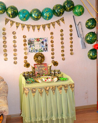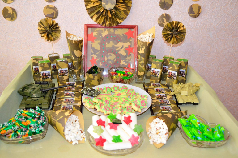 День рождения ДетскийХочу поделиться опытом самостоятельного проведения детского праздника. Аниматора приглашать не стала, т.к. бюджет был ограничен)). Сыну очень нравятся танки, по-этому за основу взяла военную тематику. Для начала оформила стол с угощениями для друзей- за обычным столом их не удержишь больше 10 минут))