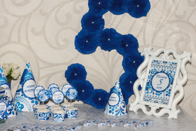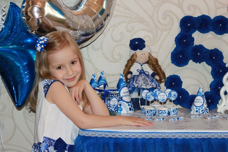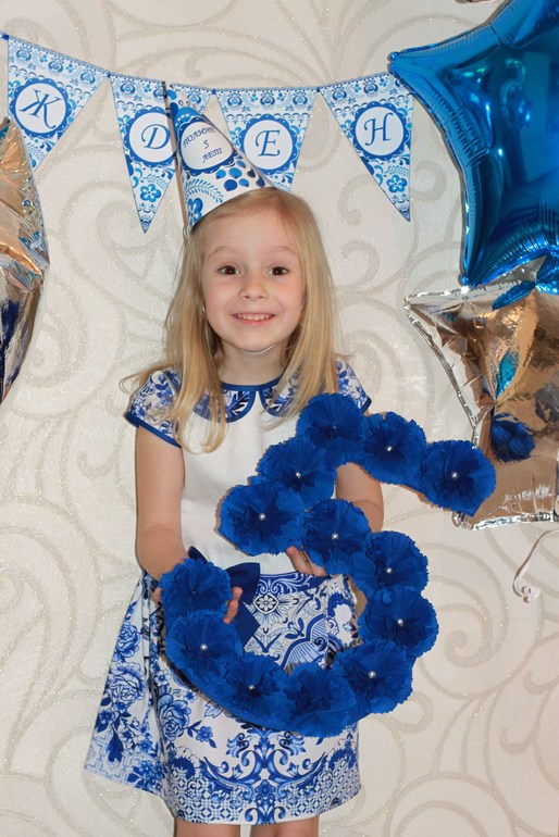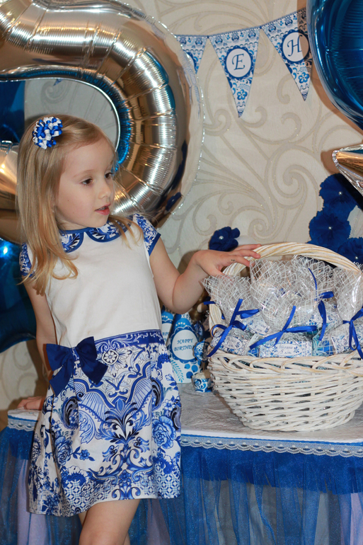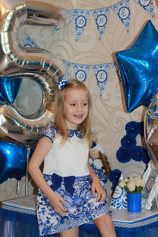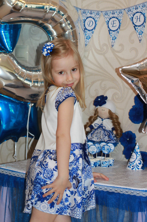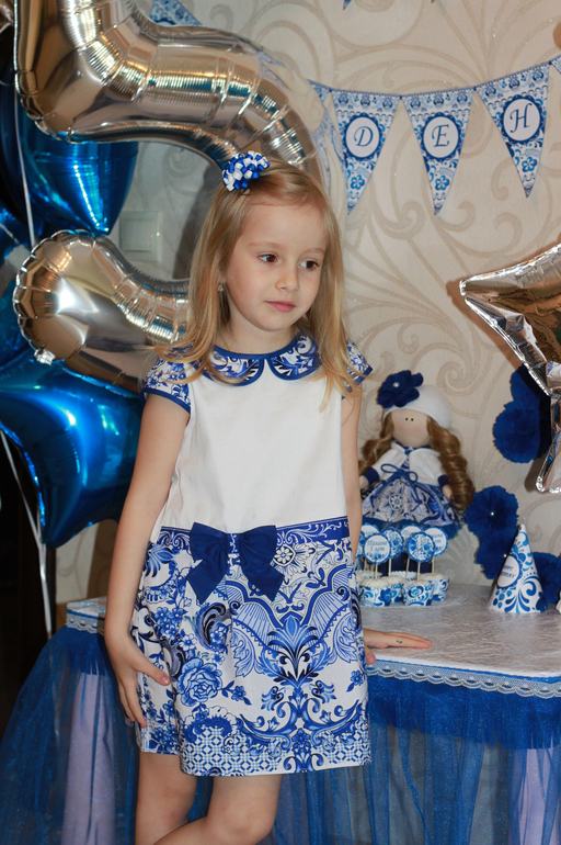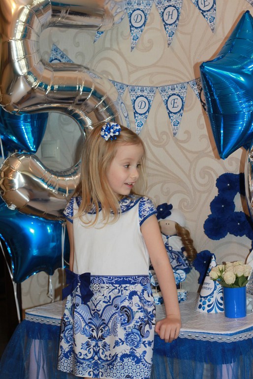 День рождения ДетскийНапишу про первый юбилей нашей любимой девочки! Сразу хочется сказать огромное спасибо всем, кто делится своими идеями здесь на ББ, очень много всего взяла себе на заметку! Любимых мультяшных героев у Полинки много, поэтому было сложно определиться с тематикой. И в очередной раз весь декор ДР определило платье. Ткань для пошива платья Полинка выбрала сама, мне ее выбор пришелся по вкусу, сочетание синего с белым - одно из самых любимых, а здесь еще и рисунок "под гжель"!