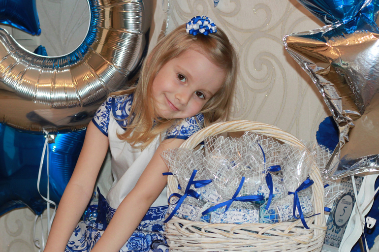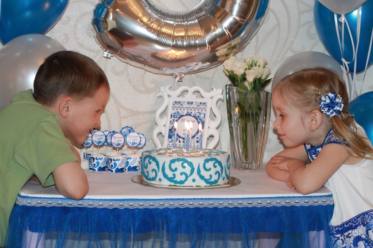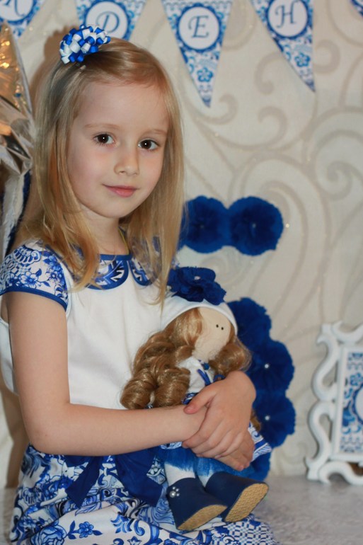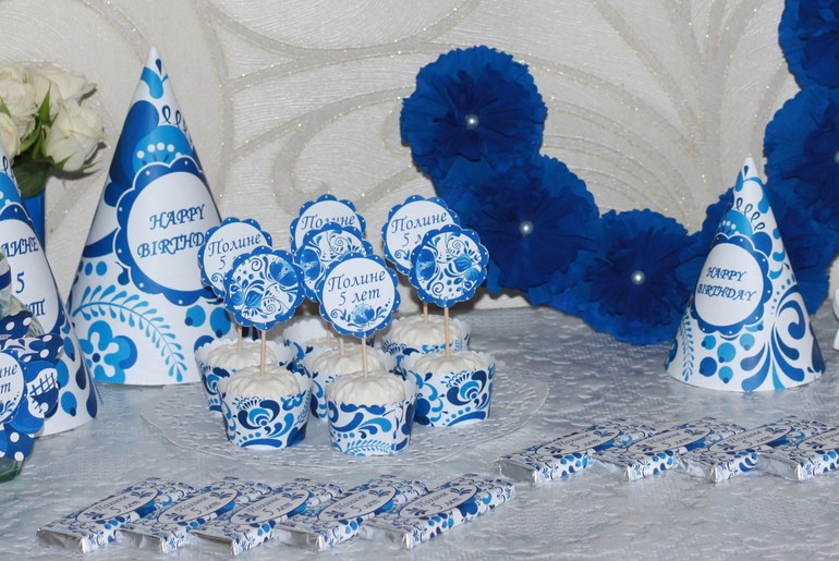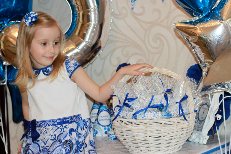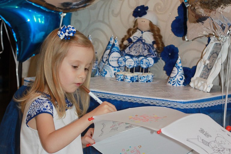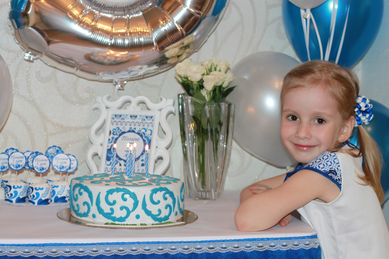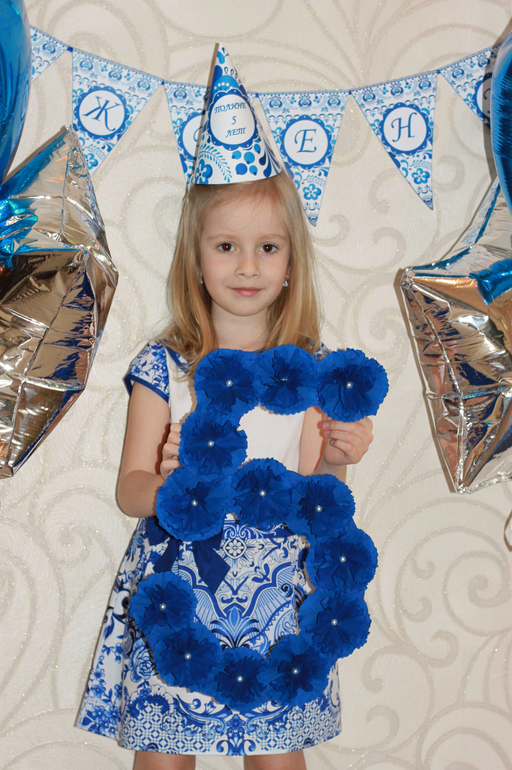 День рождения ДетскийНапишу про первый юбилей нашей любимой девочки! Сразу хочется сказать огромное спасибо всем, кто делится своими идеями здесь на ББ, очень много всего взяла себе на заметку! Любимых мультяшных героев у Полинки много, поэтому было сложно определиться с тематикой. И в очередной раз весь декор ДР определило платье. Ткань для пошива платья Полинка выбрала сама, мне ее выбор пришелся по вкусу, сочетание синего с белым - одно из самых любимых, а здесь еще и рисунок "под гжель"!