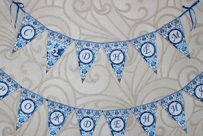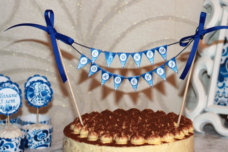Для колпачка, гирлянды, этикеток и пр. взяла готовый фон из интернета с рисунком "гжель", мне осталось добавить только надпись.