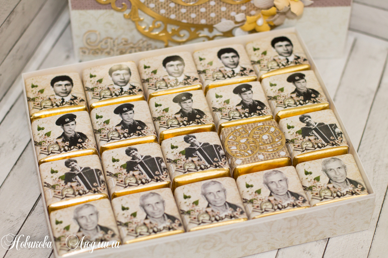 Людмила, отличный подарок! Я даже не представляю насколько это кропотливая работа, но результат того стоит явно :) Подскажите, а где можно заказывать такие конфеты с фото?