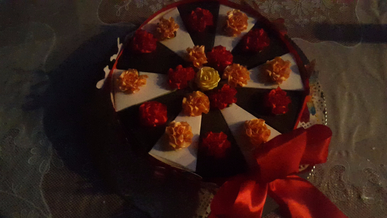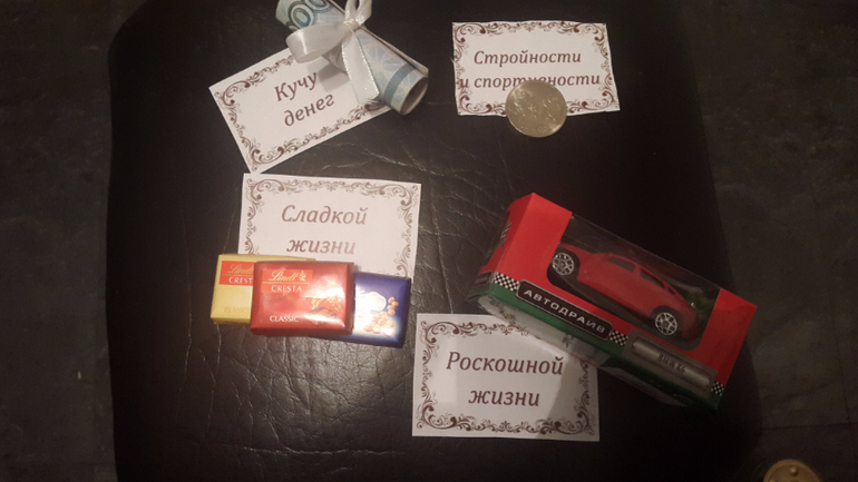 ПодаркиНа днях в подружки случился маааленький юбилей. Хотелось поздравить как-нибудь интересно. Была идея забрать ее на концерт, предупредив за несколько часов. Но нам назначили соревнования для сына на след день. Концерт отпал. И тут за 2 дня до дня Х я увидела идею про торт-пожелания. Эх мысли закрутились, благо нашла специальную, плотную цветную двухстороннюю бумагу, накупила подарочков. Вот их я покупала в два этапа, первые получились несколько больше самих коробочек. Была дилема или торт увеличивать, или подарки менять. Поменяла подарки. Две ночи творчества и вот что получилось в итоге: