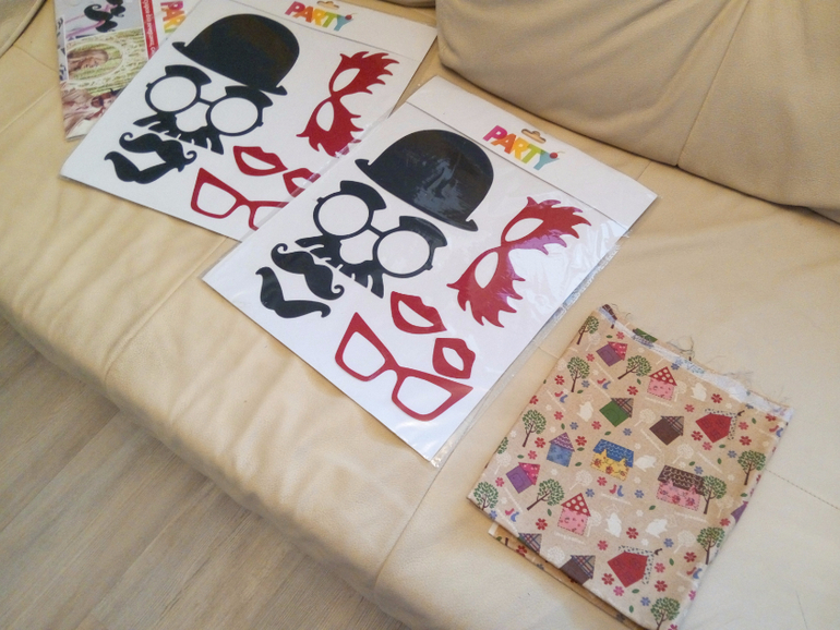 Несколько наборов с губками-усами ( когда-то, приносила их на свадьбы, чтобы гости развлекались, пока я фотографирую молодоженов, сейчас уже бум на усы прошел, а наборы остались). Отрез американского хлопка, их которого хочу сшить обоим именинникам кепки Шерлока Холмса, и, может, бабочки (надо ли?). Если что останется, из остатков можно так же сделать гирлянду, чтобы все в одном стиле. Так же есть еще множество хлопковых лоскутов однотонных, из тоже можно в гирлянду. Но какие тогда должны быть цвета? Красный? Или нет, или несколько цветов?