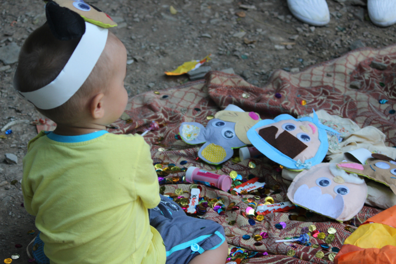 Основной фурор произвела моя пиньята "репка" , разбить малышам ее не удалось, но вот разорвали ее за милую душу, под конец истязаний я ее взяла в руки и дождем на деток посыпался конфетти, чупа чупсы, мыльные пузыри и шоколадки киндер, последнее кстати к сожалению не только растаяли, но еще и детки их радостно растоптали так, что пришлось их повыбрасывать, поэтому никогда не суйте шоколад в пиньяту ))