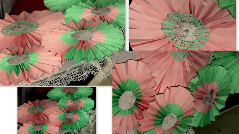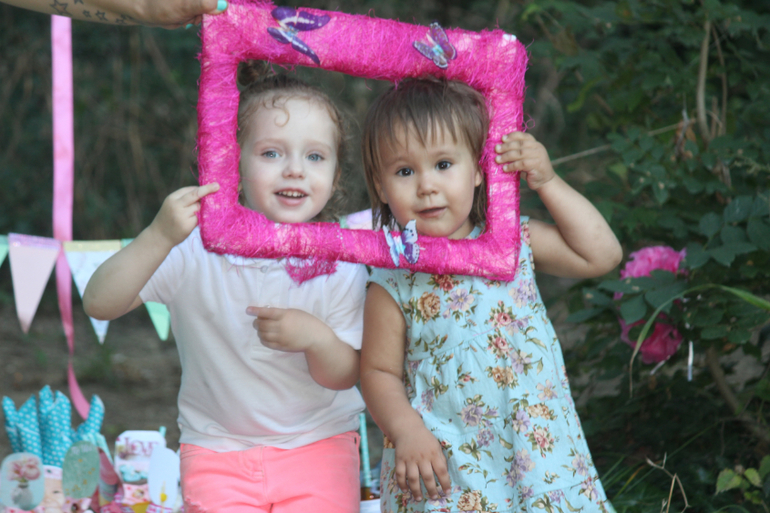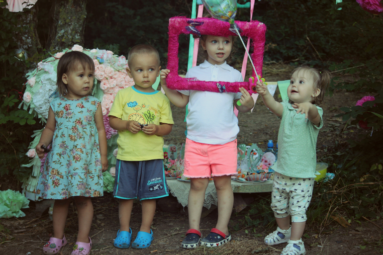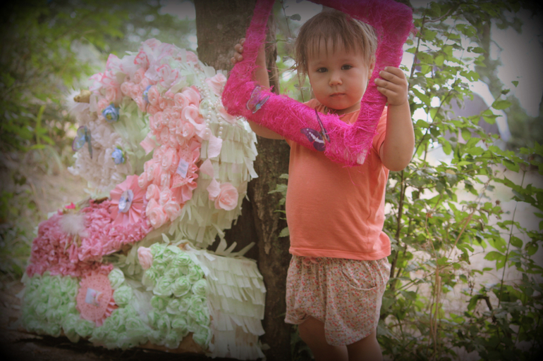 После обеда, когда я еле еле уложив спать Злату, принялась украшать место для фотозоны, повесила на деревья бумажные веера, помпоны, ветки украсила ленточками , поставила нашу красивую двоечку