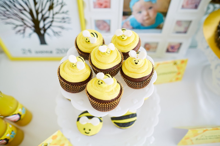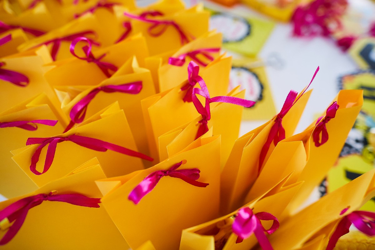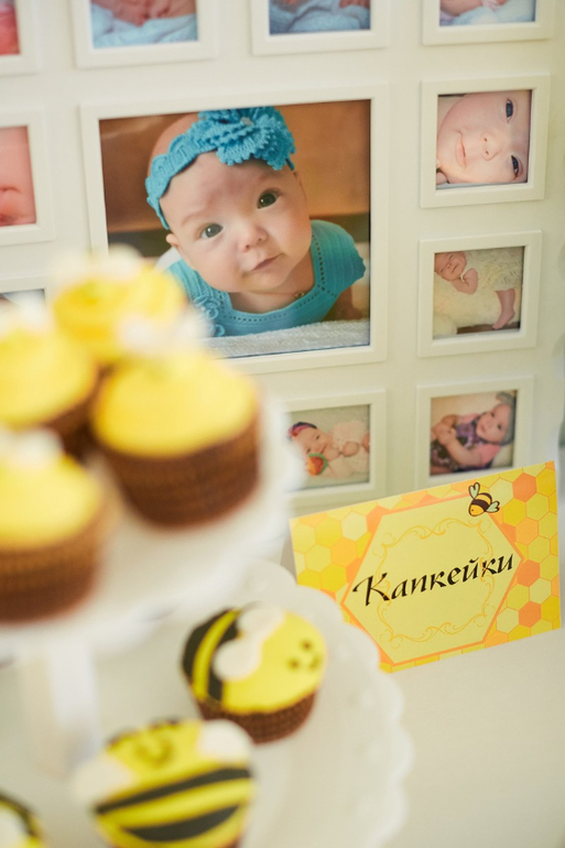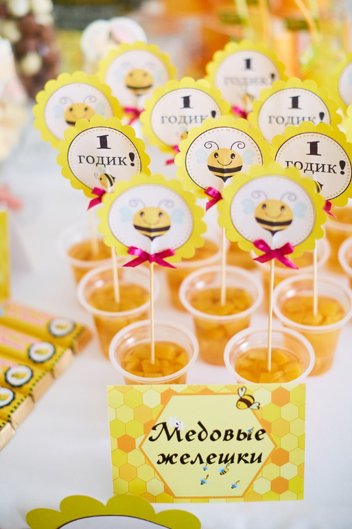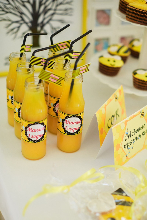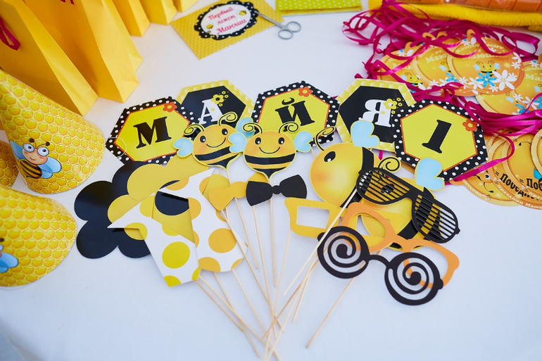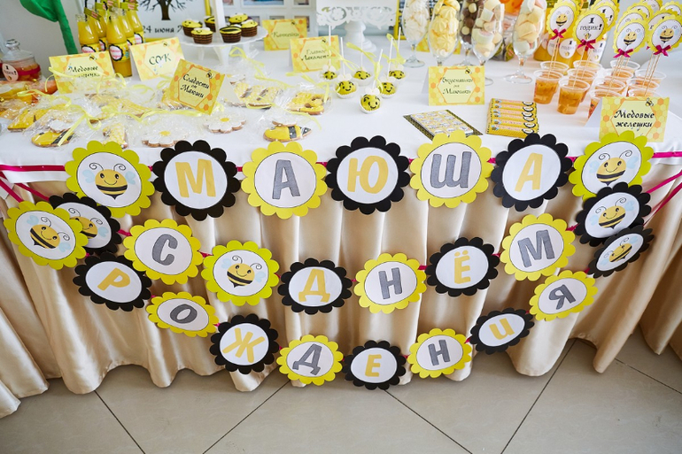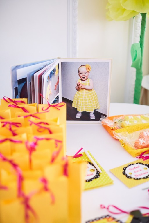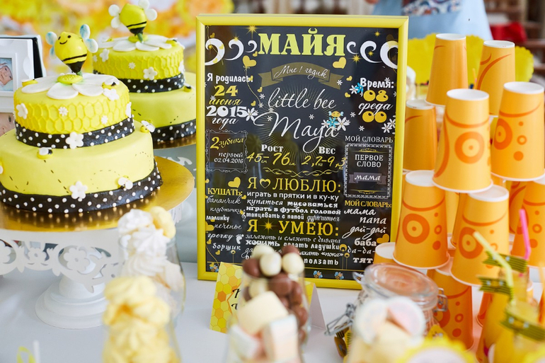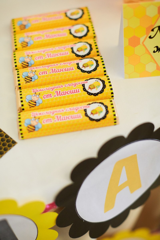 Желтые пакетики - это маленькие символические подарочки всем гостям. В каждом таком пакете были: виниловый магнитик с изображением Майи, маленькая шоколадочка в пчелиной оберточке и с индивидуальным пожеланием и красивое мыльце ручной работы в форме единички с пчелкой.