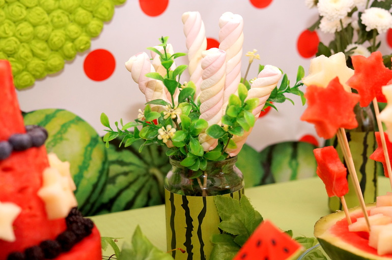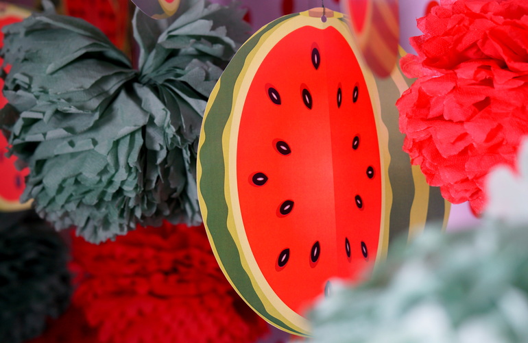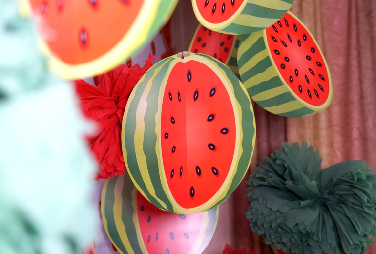 Наверху подвесили помпошки из салфеток и перемешали яркими арбузами.