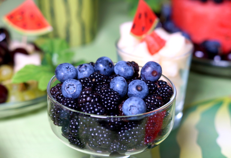 Очень много было ягод и фруктов.
