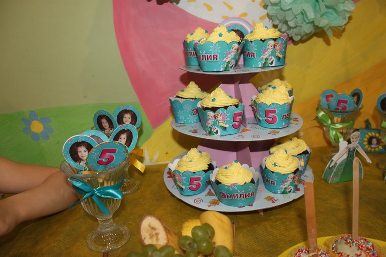 Капкейки в моем исполнении. Также канапешки из сыра с виноградом на пиках (топперы, кажется, называются). Стену над кенди-баром украсили бумажными шарами в единых тонах и растяжкой "Эмилии 5 лет".