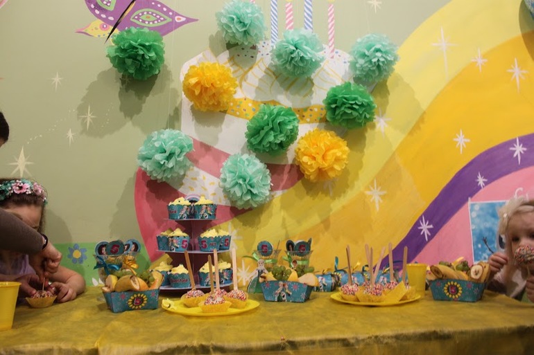 Также на столе были фрукты в бумажных стаканчиках и картофель фри с наггетсами на горячее. Конечно, не очень полезно, но на прошлое др дочери я готовила курочку с картофелем в порционных баночках (по типу как на кейтерринге), убила кучу времени, но возбужденные дети только поковыряли и бросили. В этот раз решила не тратить время на это, а сконцентрироваться на более запоминающихся моментах, о которых далее!!!