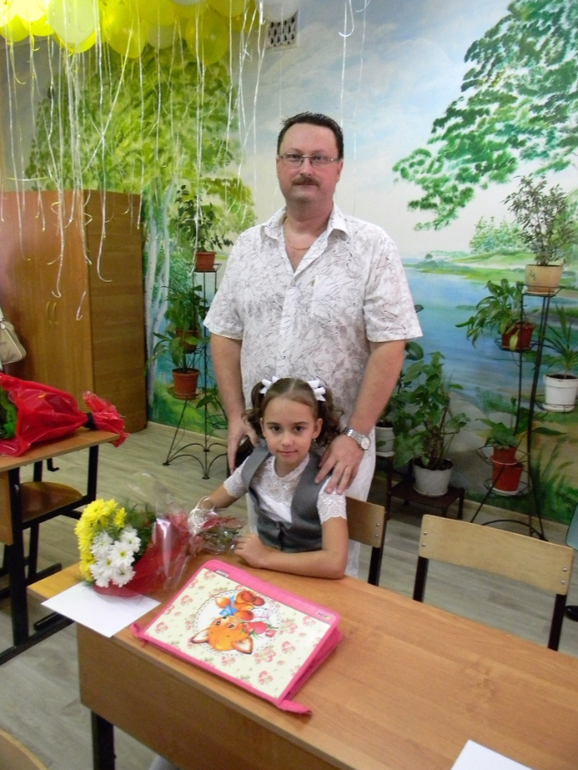 В этом году детей на линейку выводили родители, вернее один из родителей, у нас это был папа. Мы пришли в класс в десятке первых, т.к. школа граничит забором рядом с нашим домой, идти 30 сек.
