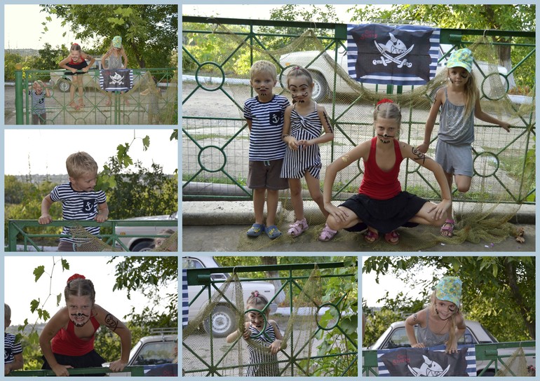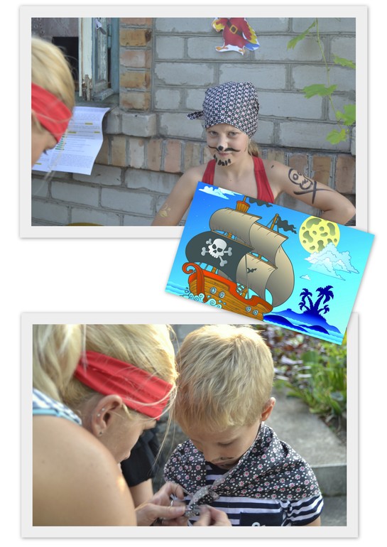 Отправив детей с мамами на экскурсию к речке я переоделась в пиратку, покормила Улю, подготовила шпаргалки, прочитала сценарий и подготовила музыку. И вот мои будущие пираты уже возле калитки. Конечно я их встретила в образе капитанши . Мы познакомились заново, придумали каждому ребёнку пиратские прозвища и раскрасили свои лица, что бы стать похожими на настоящих морских волков.
