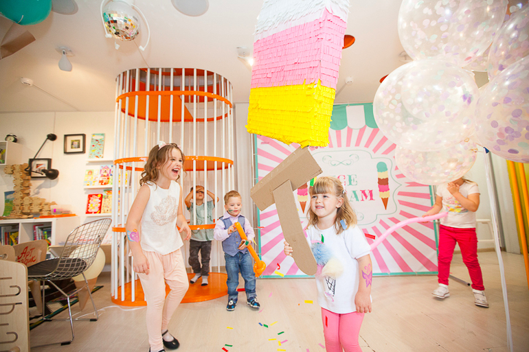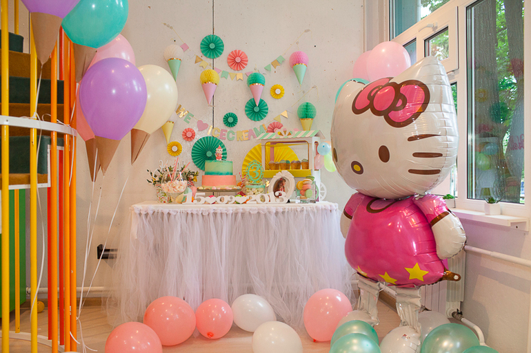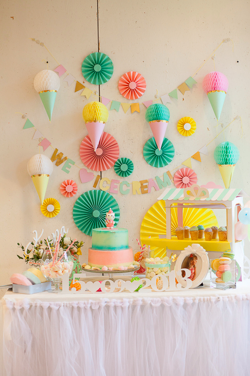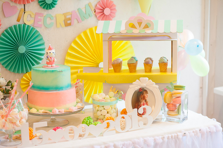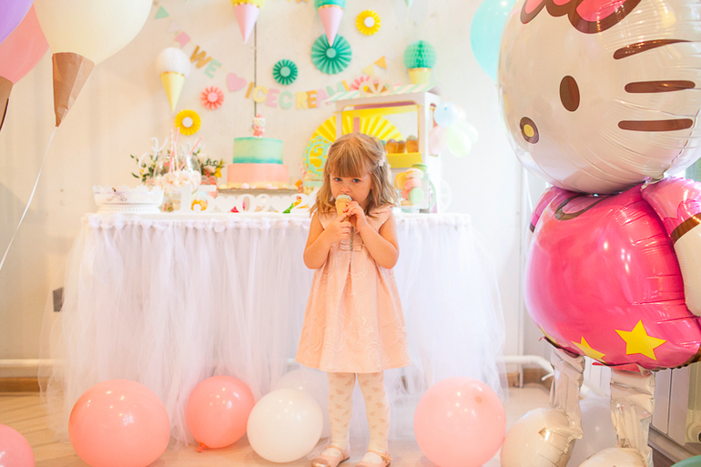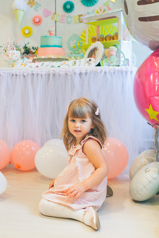 Идея праздника: почему-то захотелось чего-то нежного, воздушного и вкуснющего, так родилась мысль об Icecream Party. Мороженое Кира очень любит. Посмотрела картинки по этой тематике - всё так, как я хотела, оставалось воплотить идею в жизнь.