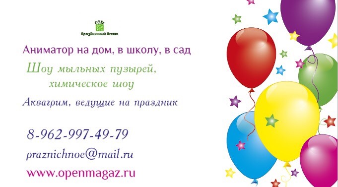 В программе анимация, аквагрим, мастер класс, мини фокусы, пузыри, мини квест, красивое поздравление, шарики, дискотека, викторины по тематике...)