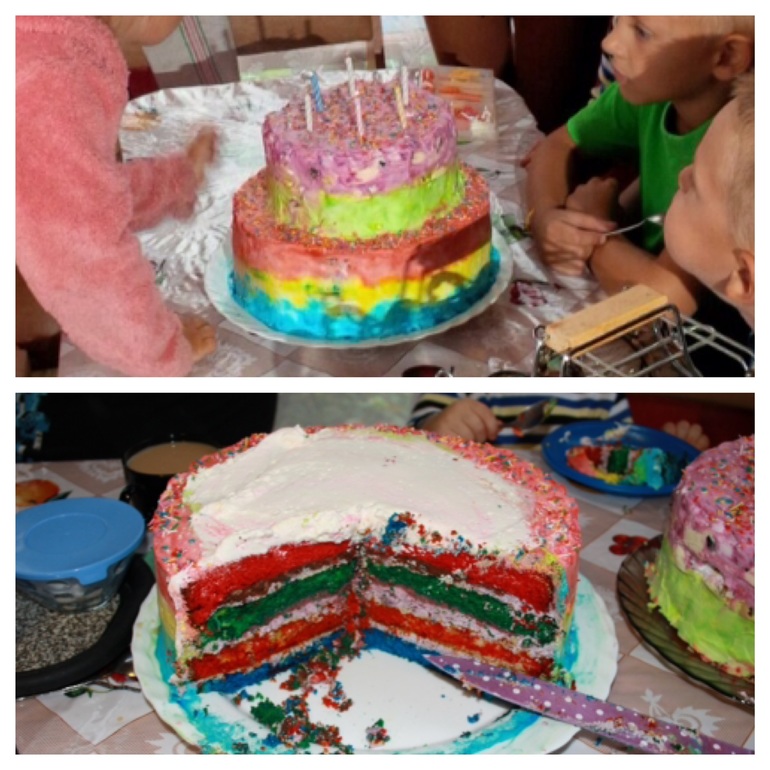 Не знаю, что сказать о торте. Торт должен быть на дне рождения. Но я устала от мастичные тортов и точно не хотела делать фигурки , тк элементарно не успевала, тк стояло много задач. Да и по опыту детей на празднике радует толпа друзей, а не красота торта. Торт был огромный! 6 кг точно. Может больше. Но это ж почти на 20 человек. День рождения в клоунском стиле, поэтому и торт яркий как и весь праздник. Фото, конечно, неудачные. Но что есть. Верхний торт - графские развалины ( безе, чернослив , грецкие орехи, крем). Нижний торт: разноцветный бисквит , черничный творожно-сливочный крем, клубничное конфи, слой шоколада. Детям очень понравилось кушать яркий торт.