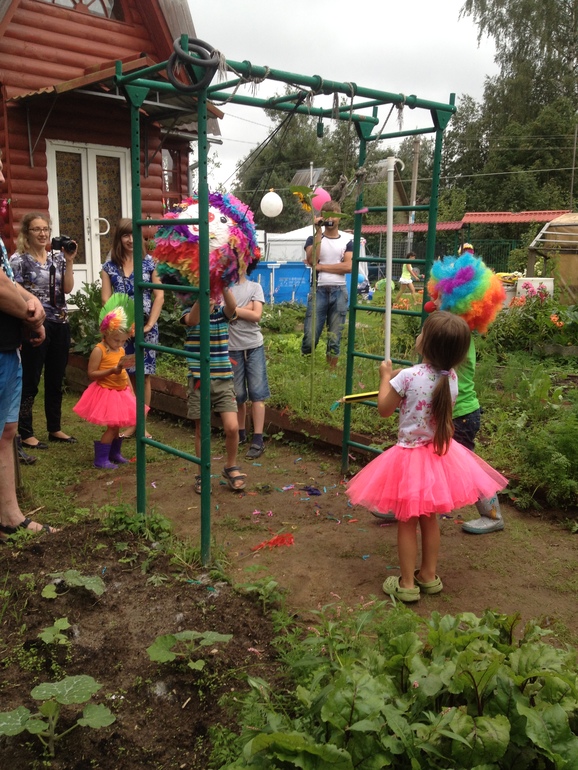 В этом году пиньята была забавным клоуном. Все дети с азартом били по ней палками. А пиньята шаловливо отпрыгивала на привязанных резинках и не поддавалась. Наградой детям за победу была россыпь конфет, которые молниеносно собрали с земли