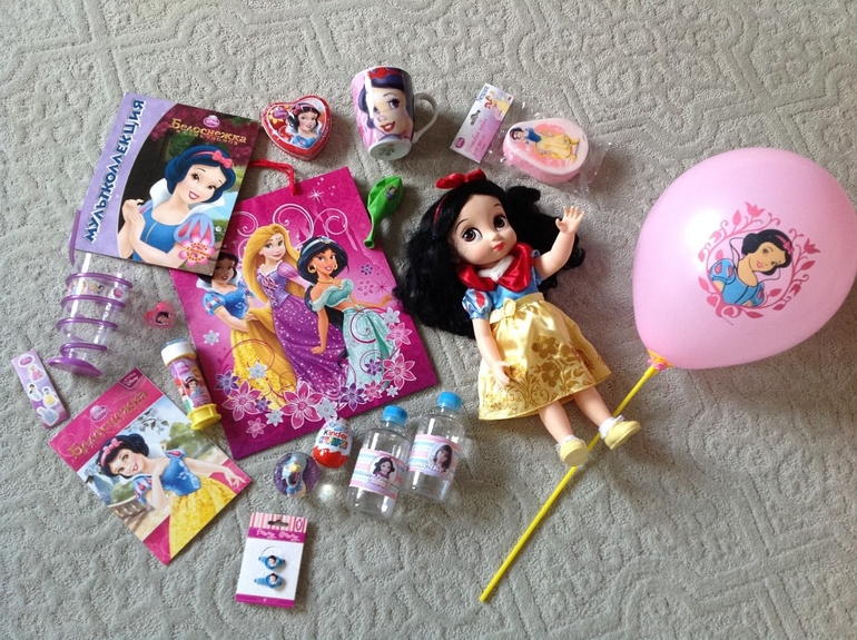 Были еще подарочки - куча куча всего с Белоснежкой - киндер, мячики, заколки, конфеты, штампики, журнал, носочки, диск с м/ф, книжки, большой бокал с трубочкой, чашка, поильник, мыльные пузыри, кольцо, наклейки, мочалка, шарики, тетради (на фото не все...)