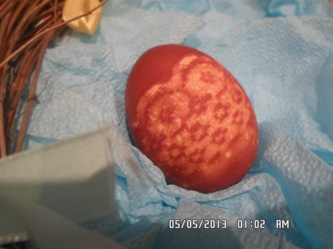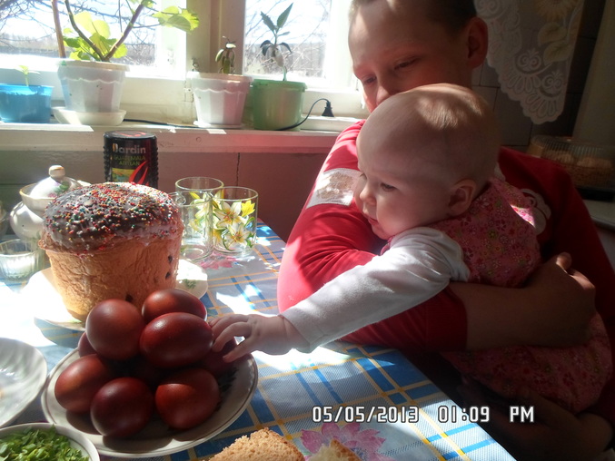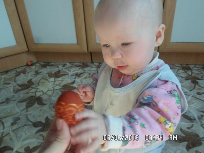 утром дочурке вручило ее первое пасхальное яицко, кстати в этот день мы впервые попробовали белок