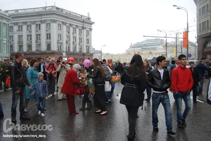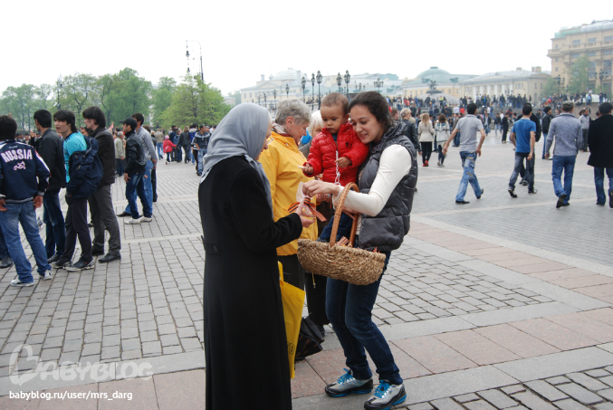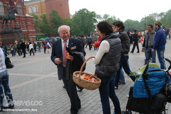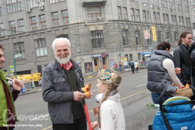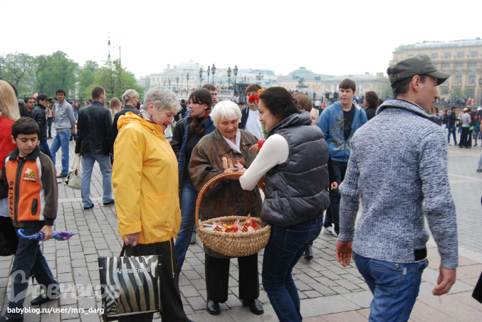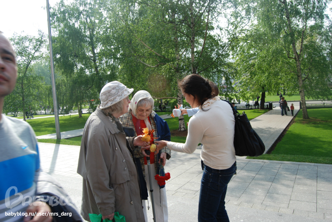 9го мая мы пошли втроем( я сыночоек и наша бабушка) на Красную площадь, я приготовила для 85 старичков небольшие подарочки - упаковала по 9 конфет (мармеладных, и др(мягких) в органзу и фетр - перевязав каждый кулечек георгиевской лентой. (хотела сделать 100 но накануне ночью у меня кончились конфеты а утром сбегать купить уже не успела...) так вот хотели еще столько же гвоздик купить но по дороге на Красную площадь нам уже ничего не досталось - купили всего 10 в одном ларьке... дите в коляске, ее везет моя мама, я несу огромную корзинку с этими свертками, и часть в пакете,(у меня кажется больше 10 кг получилось...) так вот пока мы доехали до Красной площади... в метро 2 товарища лет 35 наверно пристали к маме - дай нам! он дала им(я очень рассердилась. потому что сидела до 3:30 ночи все это упаковывала, а она раз и отдала двум бездельникам не имеющим никакого отношения ко Дню Победы... потом вышли, стали выискивать глазами старичков(ну в метро пока ехали тоже нескольких поздравили). Начали поздравлять! ТАК приятно было видеть радость на их лицах, как они улыбались, как сердечно благодарили, как удивлялись!!! Но просто ужасно злили и поражали молодые люди... один подбежал схватил кулек и убежал !!! (????) еще трое роста как баскетболисты наверно, подошли - пробасили а нам можно? я говорю НЕТ - в ответ такое неописуемое удивление на лицах и вопрос а почему? (думала побьют сейчас наверно:) я говорю потому что вы сами можете поздравить старичков, развернулась и ушла. Потом подошел дядя - говорит ДАЙТЕ РЕБЕНКУ. (он не сказал - простите пожалуйста а вы не могли бы пожалуйста дать для моего ребенка 1 штучку? как мне кажется сказалы бы я еслиб очеь захотелось что-то урвать для своего дитяти:)) моя мама ответила - НЕТ - и опять такое удивление - а чё? мама говорит а то что мы поздравляем с Днем победы ТОЛЬКО СТАРИЧКОВ! Кто-то думал что это какая-то организация, кто-то думал что я это продаю. (много женщин подходили говорят продайте нам мы тоже хотим поздравить ветеранов, блин а раньше нельзя было подумать?) НИКТО не понимал ЧТО это такое, но всем было нужно!