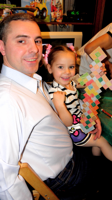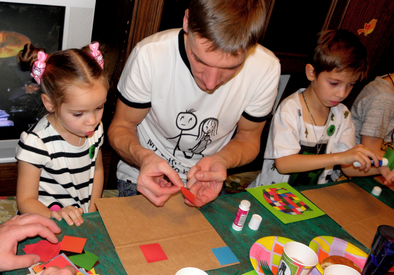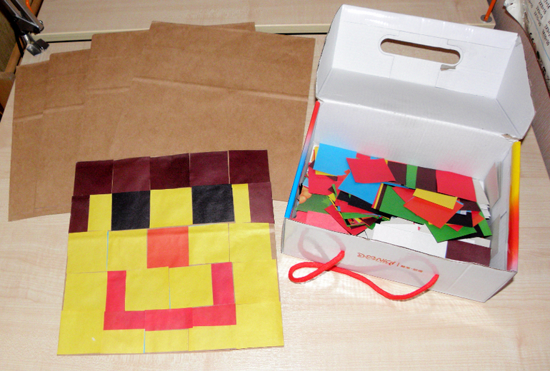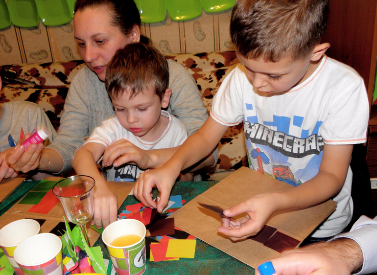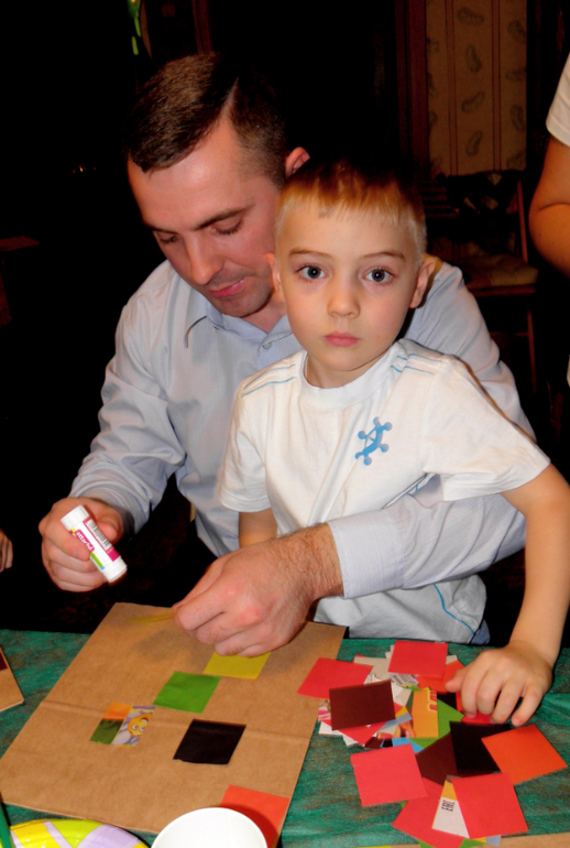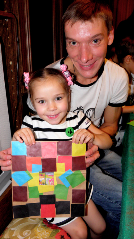 После небольшой паузы для взрослых,когда дети успели поиграть между собой, я начала новый конкурс. Всех усадила за стол, выдала каждому по крафт пакету,поставила поднос с уже нарезанной на квадраты цветной бумагой,клеем и ножницами и начала конкурс. Дети снова взялись за это и интересом,а главное все сидят и тишинаааааа.......)