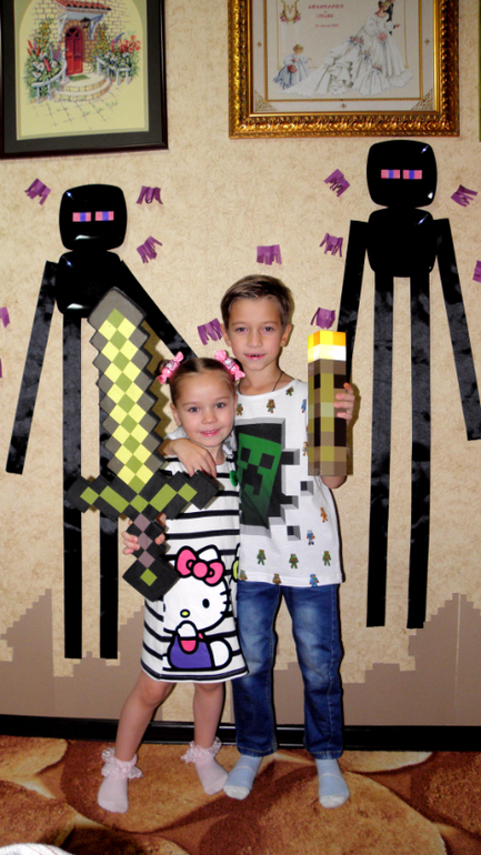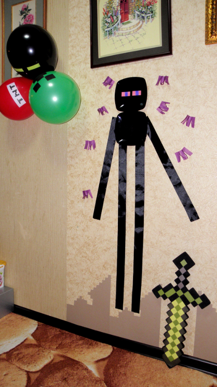 В другой комнате тоже захотелось как то изобразить дух игры,нашла идею в интернете и быстренько ее воплотила в жизнь) Два Эндермена поселились у нас в другой комнате) Под ними развесила обрезки картона после вырезания мечей,они туда отлично вписались и Матвей сказал,что напоминают развалины города Майнкрафт)