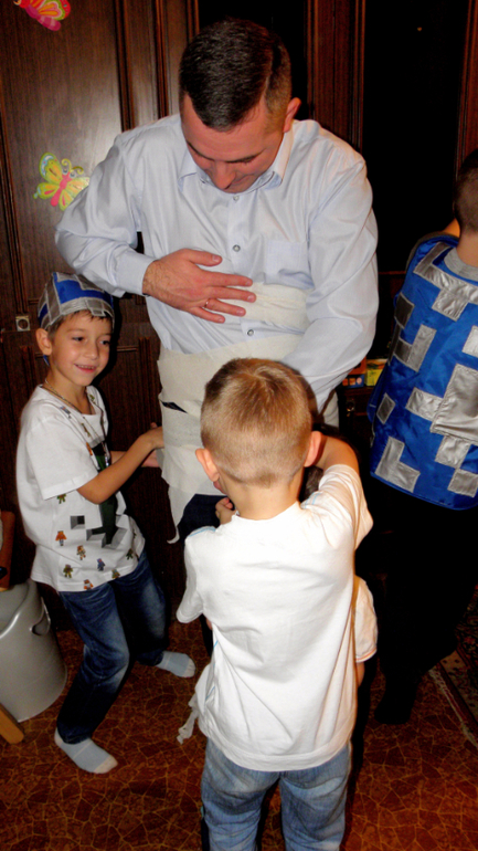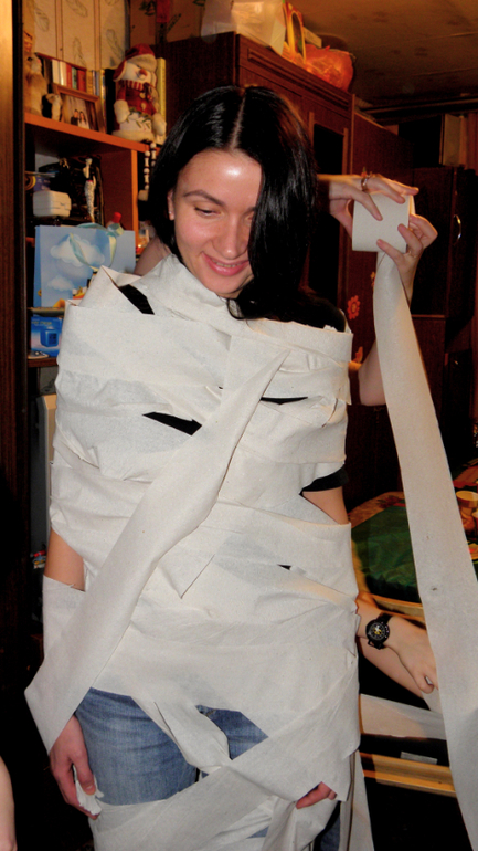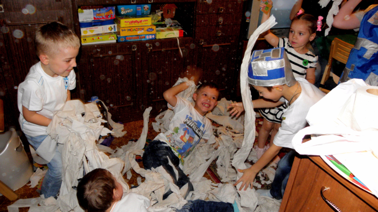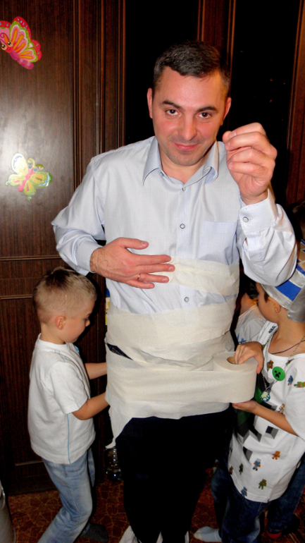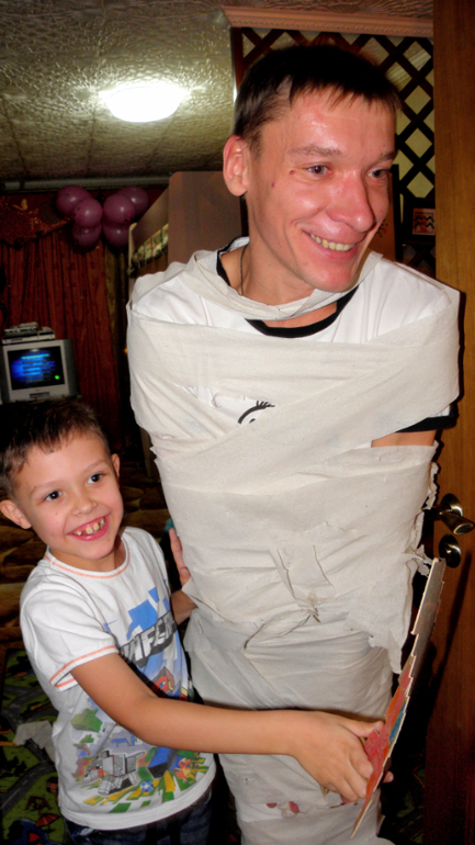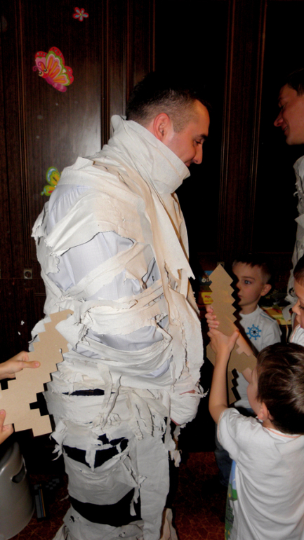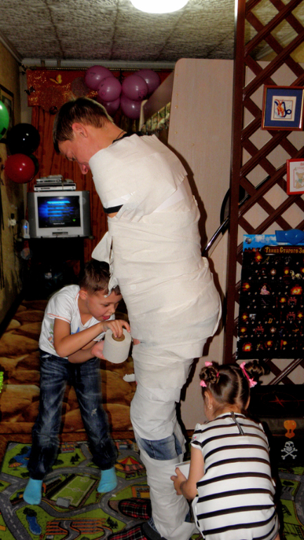 Сразу же по теме провела второй конкурс,пока дети не разбежались) Выдала им по рулону туалетной бумаги,выбрали трех зомби и пошло веселье,не знаю как взрослым,а дети были в восторге просто) Под конец как всех замотали,нужно было победить Зомби,дети вошли в раж и побили наших бедных зомби,благо картонными мечами,те еле ноги унесли) После этого началась еще одна забава,все содрать с зомби,какое счастье для детей было потом в этой бумаге по беситься) Дали им пять минут и по команде дети сами же и собрали все за минуту,так что ничего страшного не случилось,это для тех,кто переживает за чистоту в квартире,дети на перегонки собрали все до крошки))))