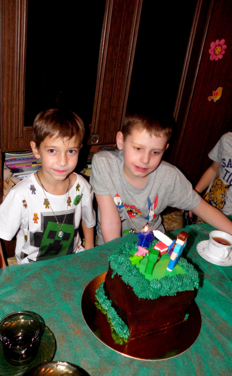Ну и под конец,всех рассадила за стол и мы вынесли наш тортик) Матюхе оч понравился,его испекла нам тоже Эля,очень вкусный и красивый)))) Конечно главный тортик у нас был в стиле Майнкрафт, но и о тортике для друзей мы тоже не забыли,вынесли небольшой со свечками и все дружно его задули)