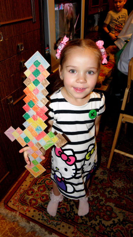 Как только все поели,дети по бесились, я начала первый конкурс.Для этого я подготовила картонные мечи,разлиновала их и выдала всем фломастеры и карандаши. Один меч был как образец,его выдали самому младшему гостю) Дети подошли к этому с большим энтузиазмом)