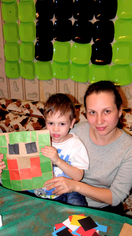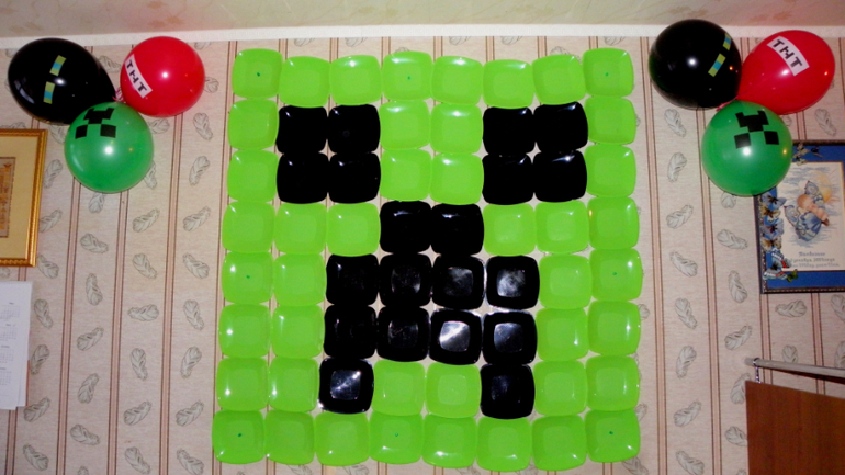 Увидев идею Крипера из тарелок на стене,я сразу же загорелась этой идеей и поняла,что обязательно ее реализую) Это надо сказать оказалось не так просто,как кажется) Во первых тарелок бумажных нужного цвета и квадратной формы днем с огнем не найдешь,если заранее об этом не позаботиться,например с Амазона) У меня такой форы не было и пришлось брать пластиковые по безумным деньгам,но я все равно результатом осталась довольна,а Матюха был счастлив) Во вторых оказалось не так легко то их скрепить между собой и потом эту конструкцию на стене повесить,конечно у меня не идеальный вариант,где то кривит,но все равно смотрелось ярко и чувствовался дух Майнкрафта)