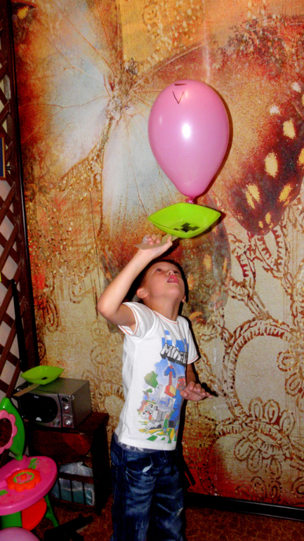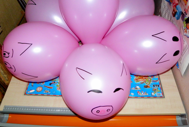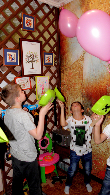После этого устроила для взрослых небольшую паузу для отдыха и забрала детей в другую комнату на небольшой конкурс) Выдала каждому по ракетке,которые сделала из тарелок глубоких пластиковых и по розовому шарику с нарисованными рожицами хрюшек,в игре Майнкрафт герои растят свинок для пропитания)))) Дети с удовольствием поиграли в шарики)