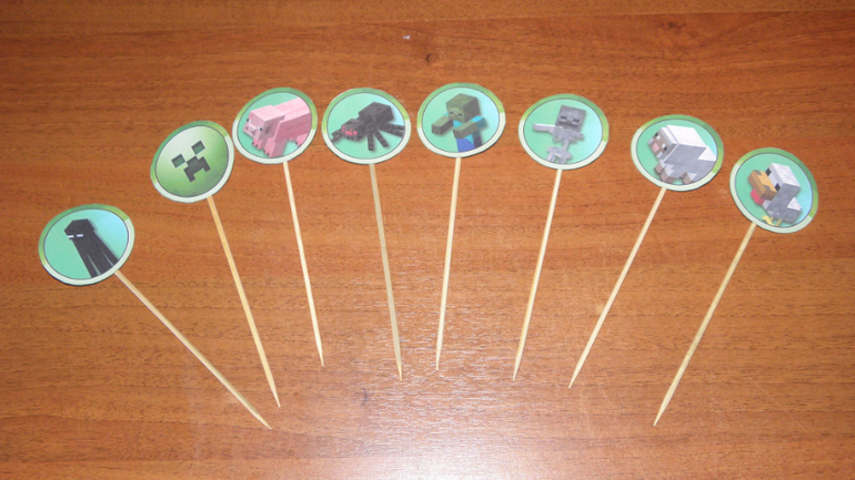 Тарелки и стаканы купила близко по теме Майнкрафт,потому что на наборы цены космические,зато получился яркий стол и салфетки подобрала тоже по стилю,слон в квадратик) В салатах тематические украшения на шпажках)