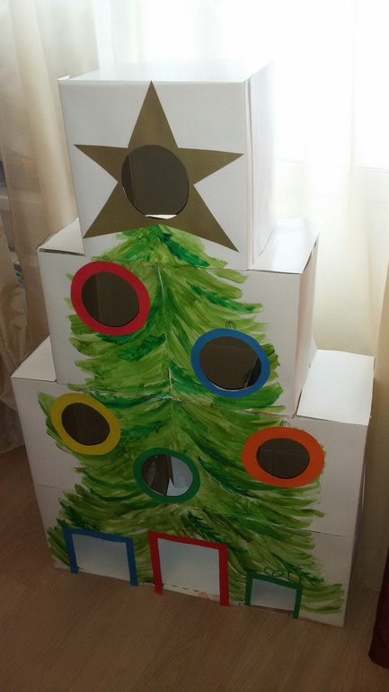 Я давно копила коробки от памперсов, точно не представляя зачем… Но потом на улице увидела игру где детям предлагается кидать шарики в отверстия, а они (шарики) внизу выкатываются. Тогда я поняла что именно хочу соорудить из коробок. Придумала ёлочку, так как совершенно не умею рисовать… Дети сегодня игру восприняли с энтузиазмом, а вечером уже вся семья, включая папу соревновалась в меткости J