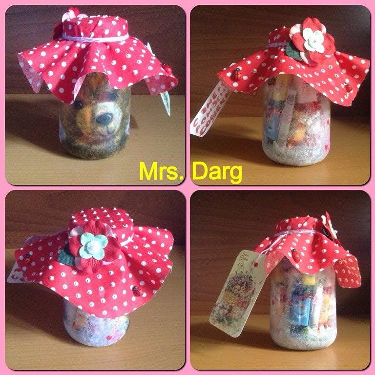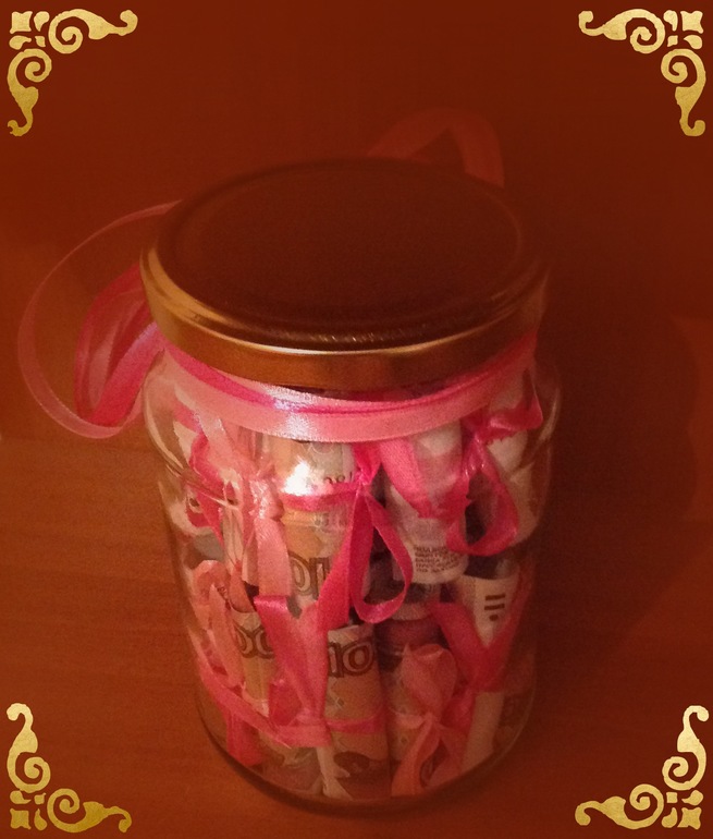В похожей баночке делала для девочки (дочке подруги) с кофетками, так же украсила саму баночку.