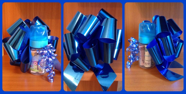 Еще дарила подруге на рождение малыша бутылочку с голубой крышкой(самую простую что НЕ пользоваться потом самой бутылкой, и в ней деньги:))