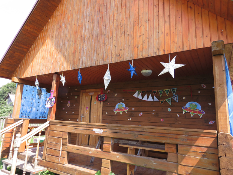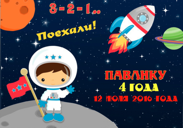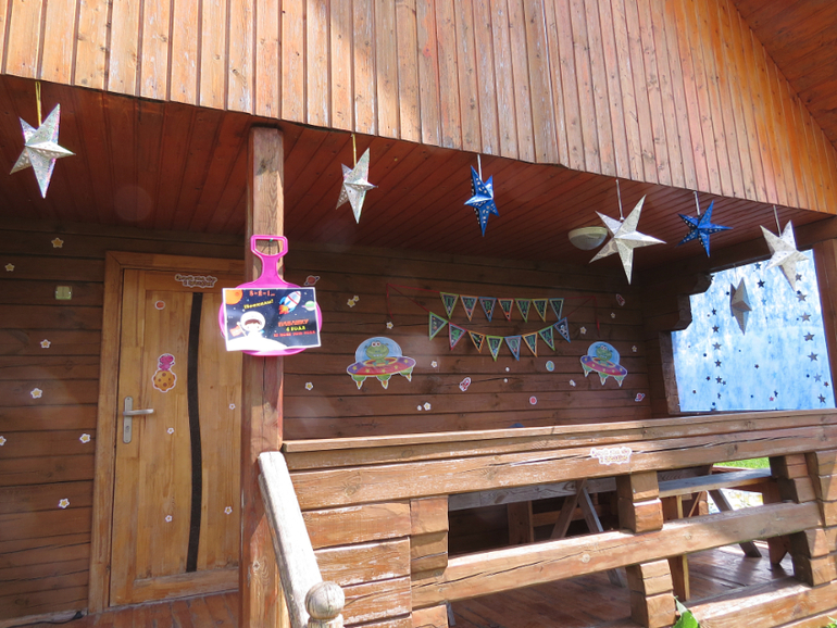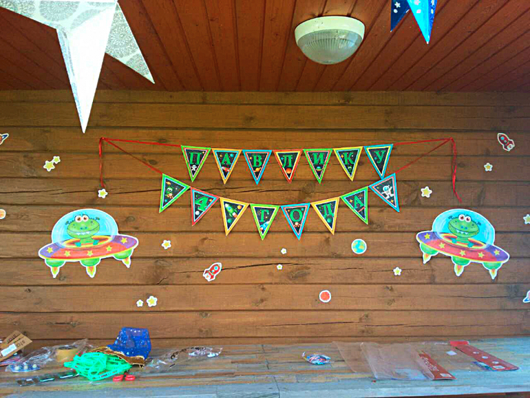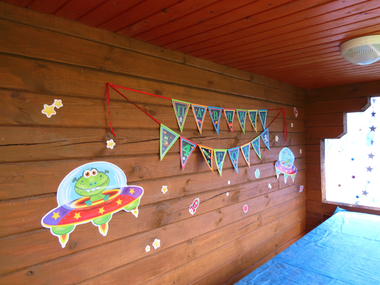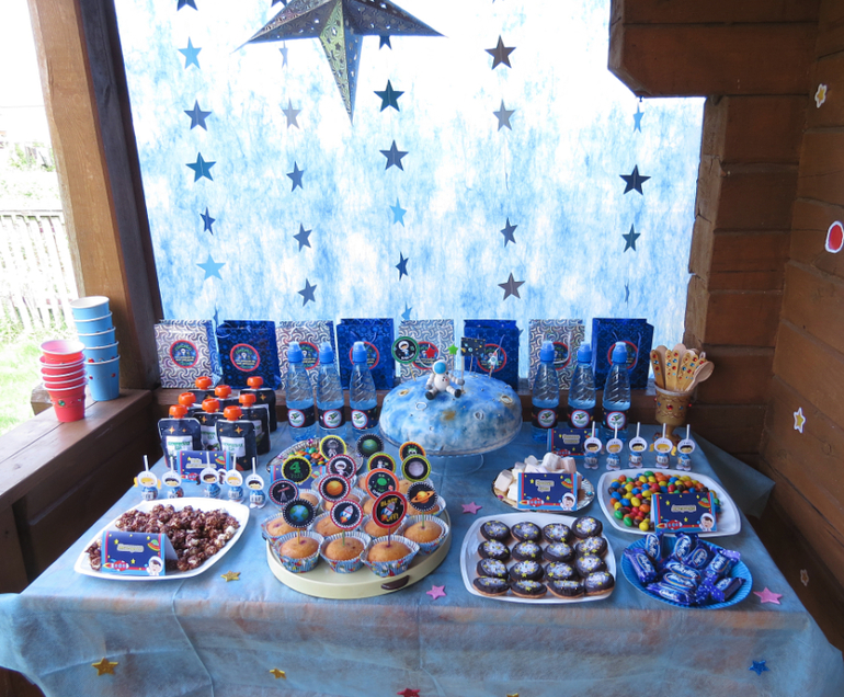 ДР у Павлика летом как всегда в деревне у бабушки с дедушкой празднуем на улице, а стол накрываем на веранде бани... В этот раз её превратили в космический корабль... Почти получилось. С боков занавесили дешевыми синими одноразовыми скатертями, на них гирлянды из синих и серебряных звезд. Объемные звезды тоже синего и серебряного цвета развесили по периметру. Рястяжку "Павлику 4 года" разумеется сделала в цветовой гамме праздника. На сима-ленде пока искала все что связано с космосом по акции взяла наклейки декоретто, ими и украсили стену...