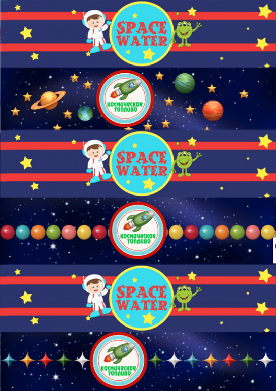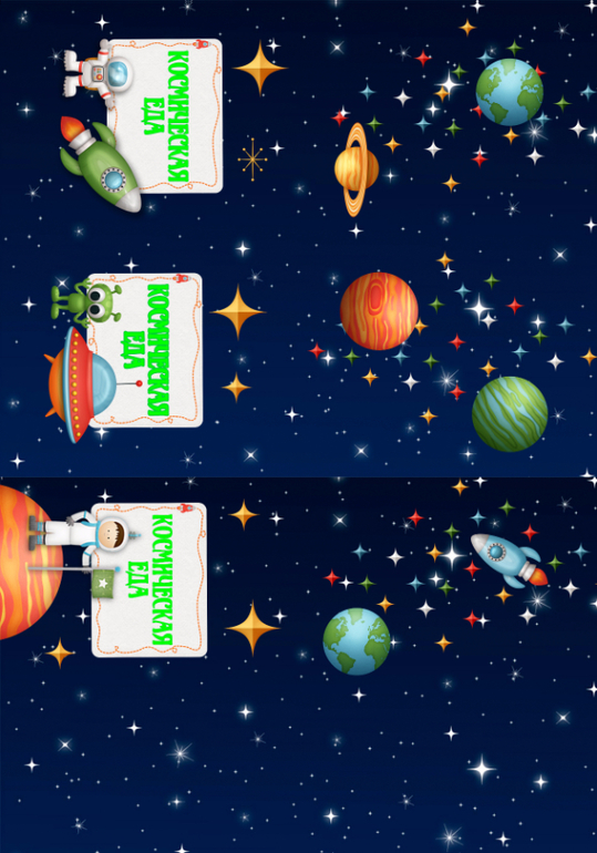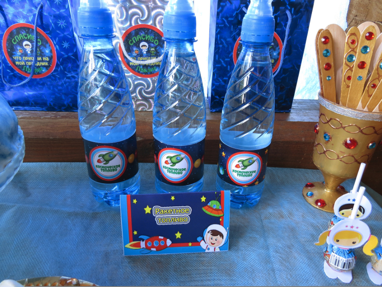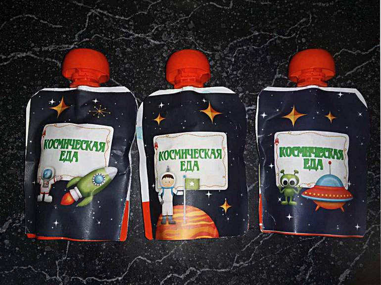 По сценарию нужна была еда космонавтов, поэтому купила детские пюрешки из фруктов и заклеила их с обоих сторон самоклейкой сварганеной в фотошопе с подписью "космическая еда". На фотке стола почти не видно, но они стояли с табличкой "паёк для космонавта"
