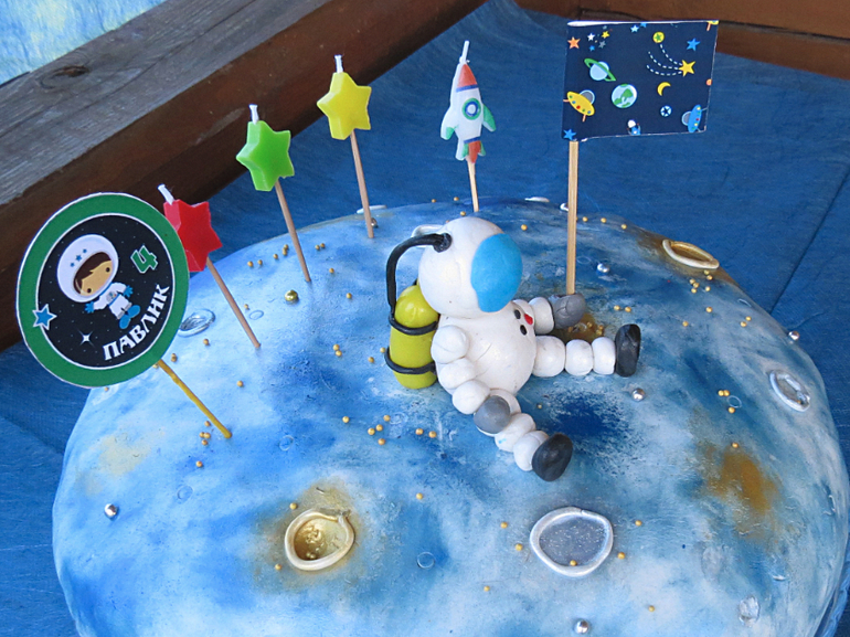 Торт в этот раз сделала полусферой, обтянула белой мастикой, особо ровно работать и не старалась, наоборот потом еще добавляла вмятин - поверхность планеты то не ровная... Укашала серебристым, золотым и синим кандурином. На фото не видно, но все так сверкало красиво... Космонавта с моими то "талантами" к лепке сложнее сварагить не удалось, примитив конечно, ну и ладно... Зато с душой... В руки космонавту дали флаг ))) А свечи в последний момент нашла ва фикспрайсе именно космические - звезды и ракета...