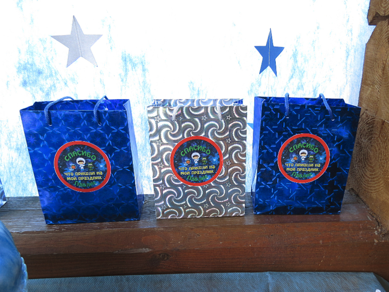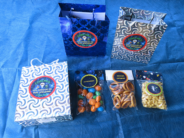 На заднем фоне сладкого стола стояли пакеты с подарками для гостей синего и серебряного цвета как звезды. Внутри были астероиды, кольца сатурна и просто космический сухой завтрак в виде звездочек в пакетике.