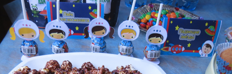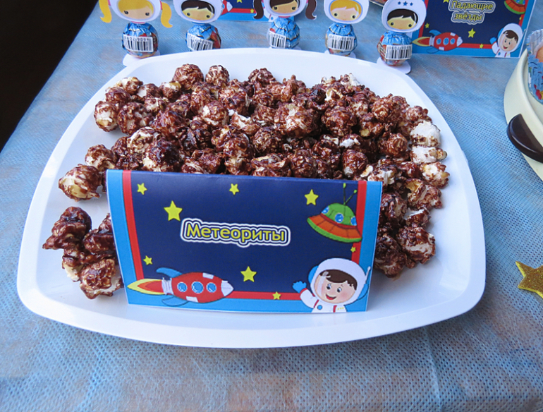 Меню незатейливо - торт, кексы, печенье галактика, попкорн подали как метеориты, M&D"s орешки как астероиды, M&D"s дражже как падающие звезды, а маршмелоу обозвали кусочками луны... На удивление дети читали и ели это всё с большим удовольствием, а я то думала что их ничем уже не удивить в плане еды... А оказывается для них главное то название )))