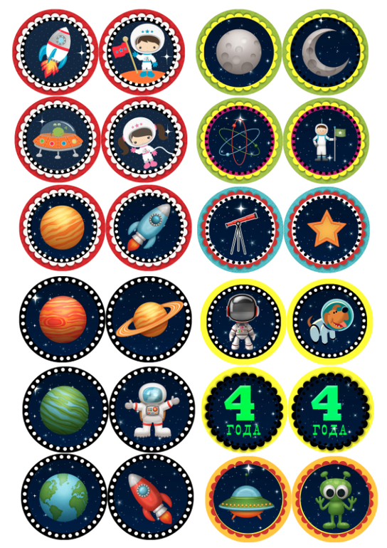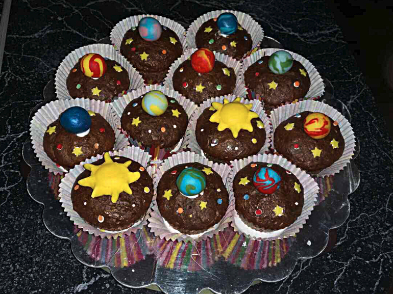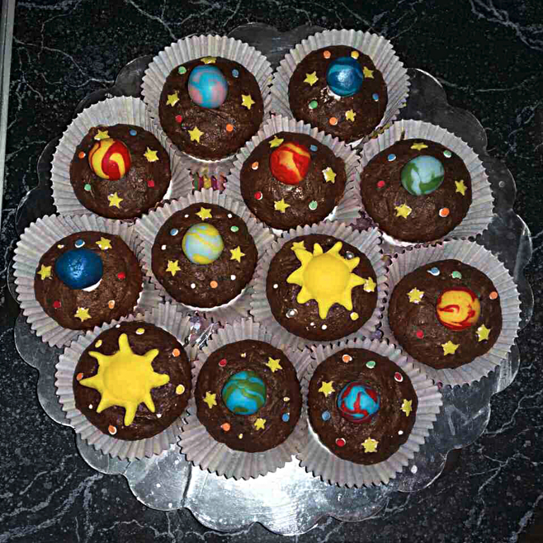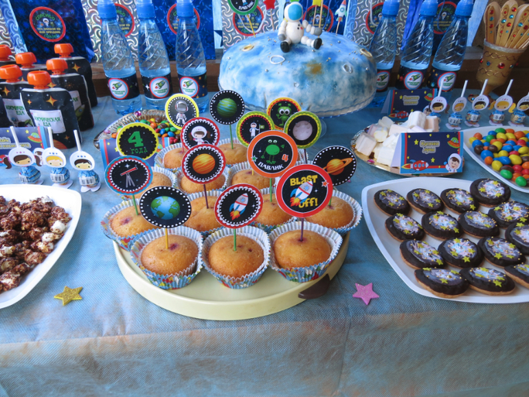 Кексы одни купила готовые и украсила их кейкотоперами, а другие испекла шоколадные с кабачками на меду ( ну типа хоть что-то полезное в море сладостей) и украсила разноцветными планетами из мастики. Получилась почти вся солнечная система.
