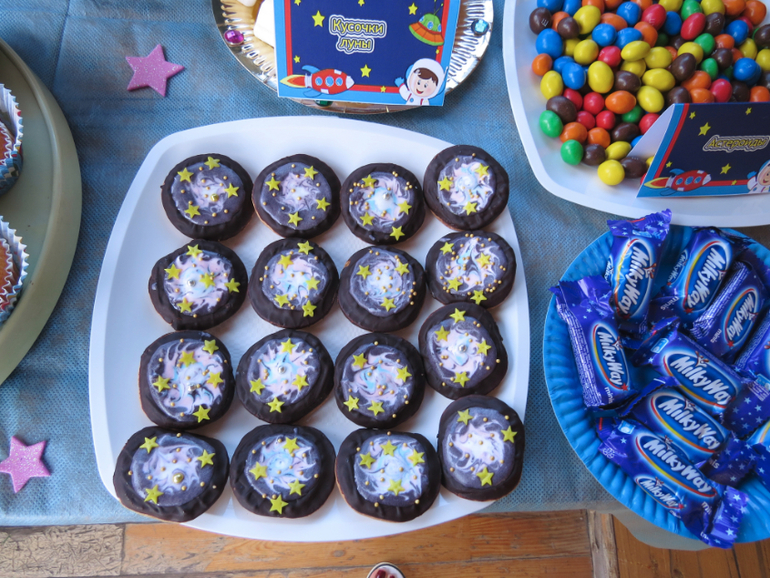Выпекать имбирные пряники как обычно у меня в этот раз вообще не было времени, поэтому просто купила круглое печенье (с шоколадом сверху и джемом внутри) и украсила его глазурью, звездочками из мастики и съедобным бисером в виде галактики. Батончики с космическим названием в переводе как "млечный путь" тоже посчитала нужным купить к столу...