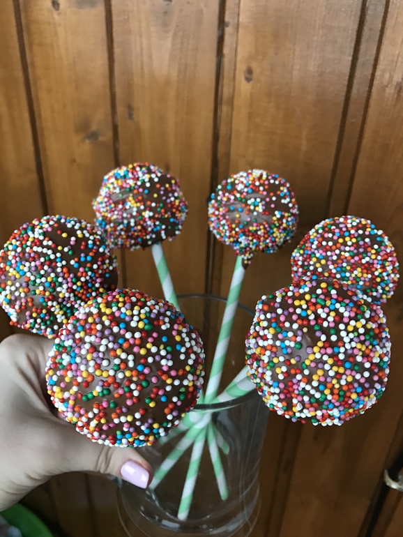 В растопленный шоколад окунула палочку, проткнула шарик до половины, заготовки постояли минут 10-15 (лучше убрать в холодильник, чтоб шоколад прихватился к палочке и попс не съехал с нее (у меня один соскочил). Ну а потом аккуратно погружаем попс в шоколад и стараемся чтоб он покрыл попс как можно ровнее (у меня криво получилось, но посыпка дефекты скрыла).