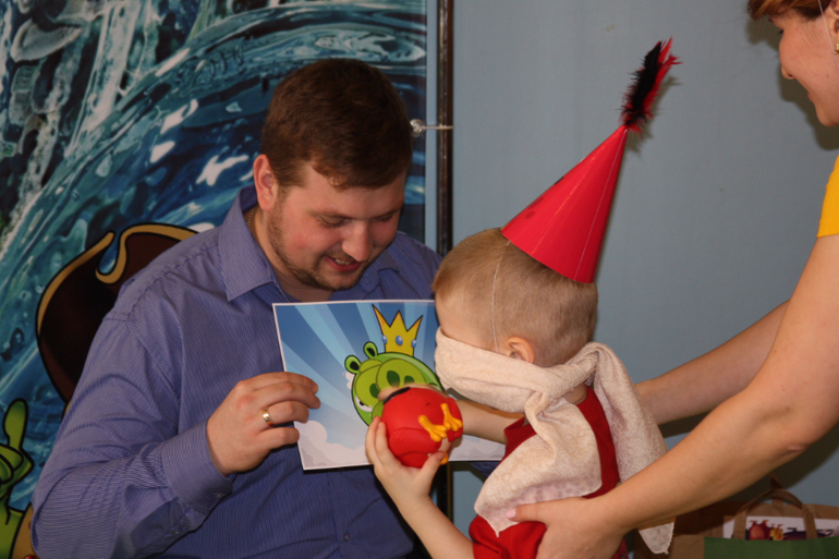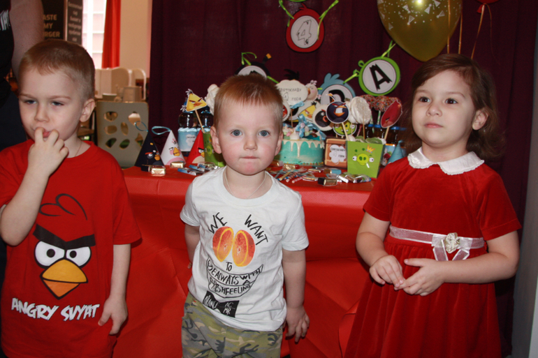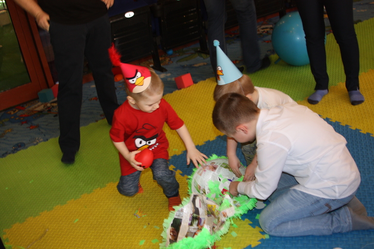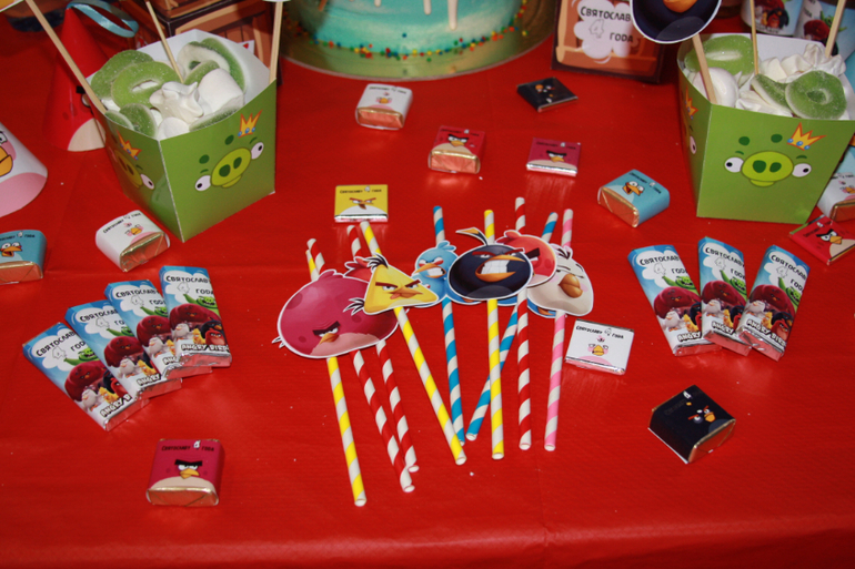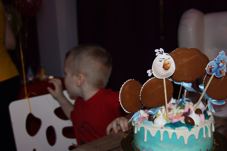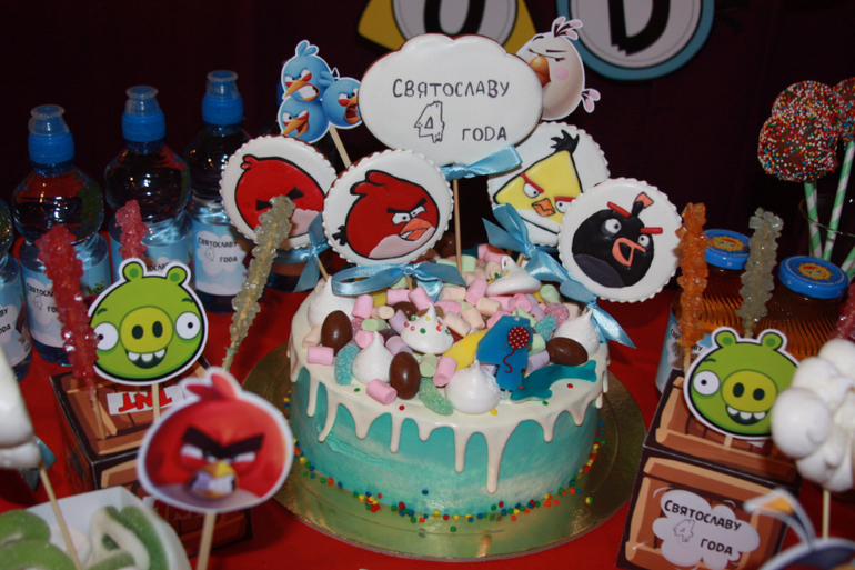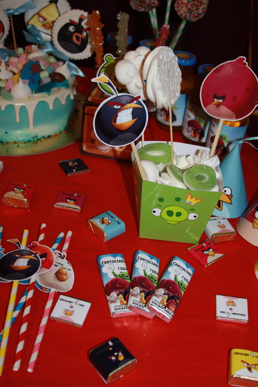 Мы заказали торт, он необычайно вкусный, три шоколада внутри, пряники и мармеладки снаружи, все как мы любим!!! Кенди бар наполнили еще маршмелоу и мармеладки, безе на палочках, конфеты и шоколад в тематических этикетках (потом детки разобрали), вырастили сахарные кристаллы, сделала сама кейкпопсы, был еще сок и вода (в детские центры берите воды побольше!!! дети хотят пить именно воду), а в подарки детям мы приготовили яйца (киндер сюрприз angry birds папа раздобыл еле еле, тк уже ледниковый период везде) а яйца эти спрятали внутри птичек. Дети были в восторге!!!![]()