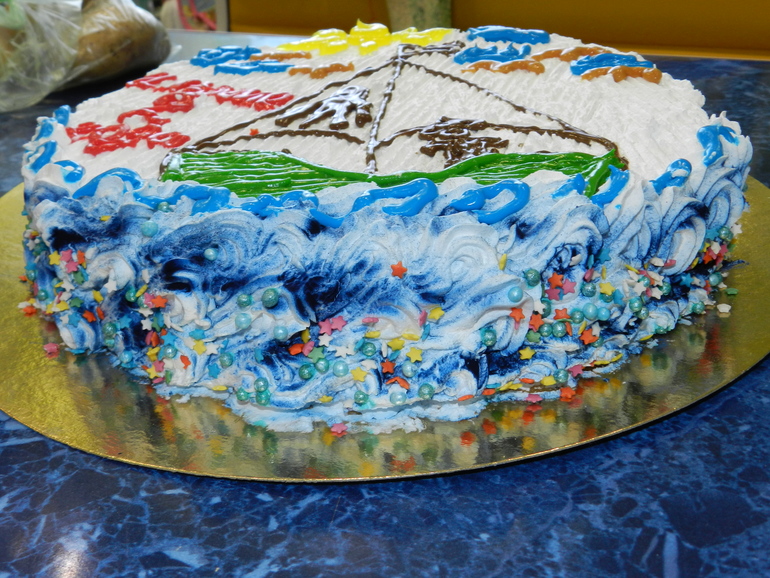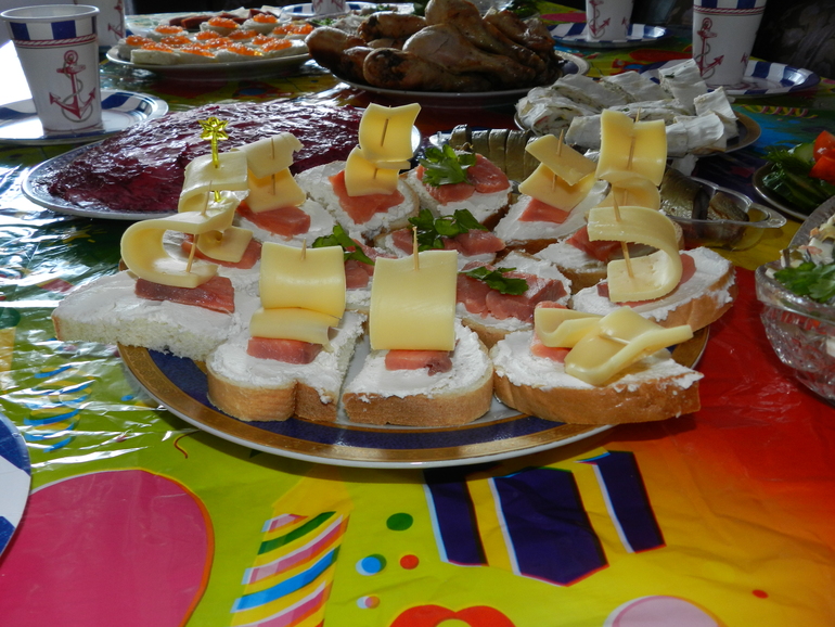 Меню было тоже морское, салат морской, рыба под губой, бутерброды с икрой и вот такие бутерброды кораблики