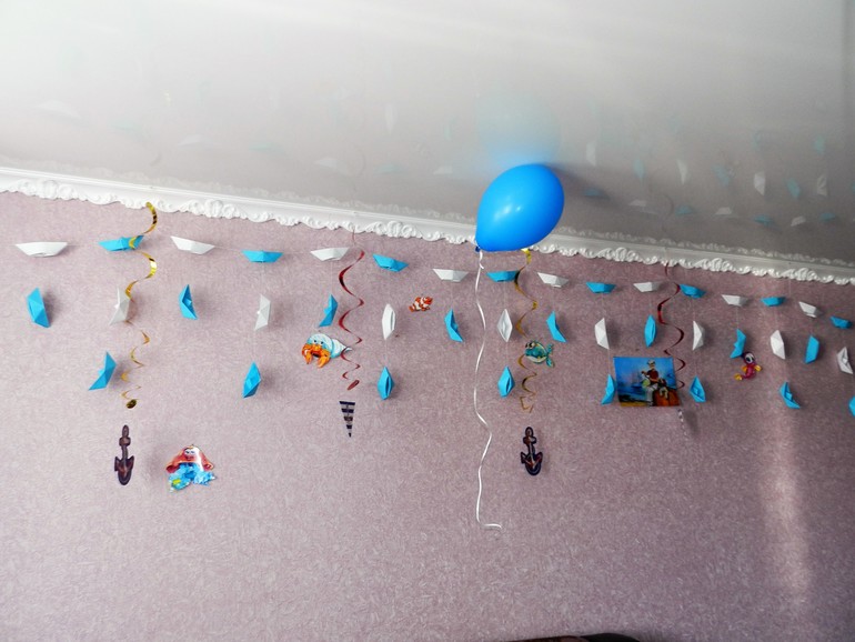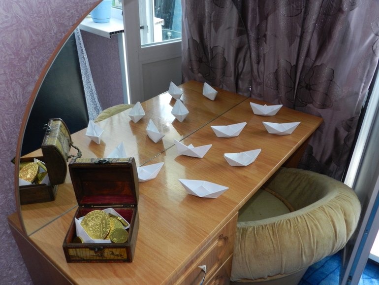 - наклейки, шоколадное яйцо или йогурт кому что можно, и кораблики.