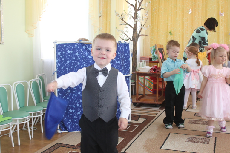 А еще для родителей и детишек было задание, придумать творческий номер. Я ломала долго голову. Причем о празднике нам сообщили в пятницу вечером, а концерт во вторник. Думала я думала... Какой-то стих выучить, не успеть , да и Темка 100% отказался бы. Танец тот же вариант. Значит надо было подходить творчески... Работали мы руками...