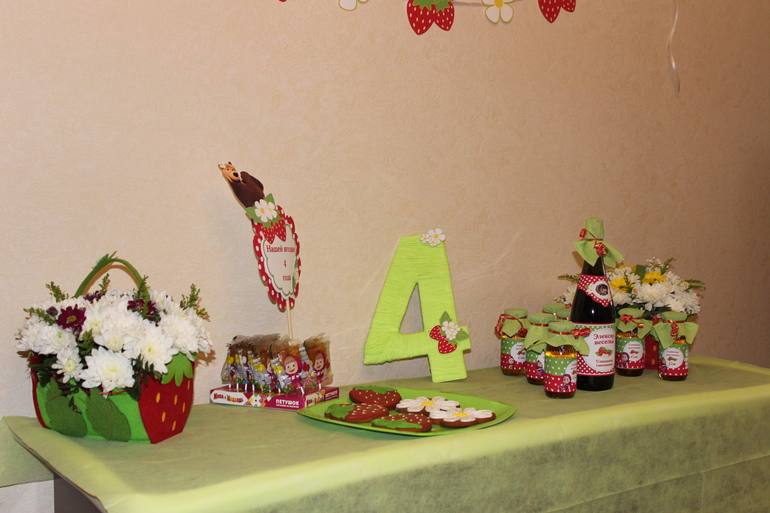Наталья,доброе утро!Если будет интересно,есть декор на 4-летие....Стиль был "Ягодка+Маша и медведь".....Для лета и сезона ягод самое то....